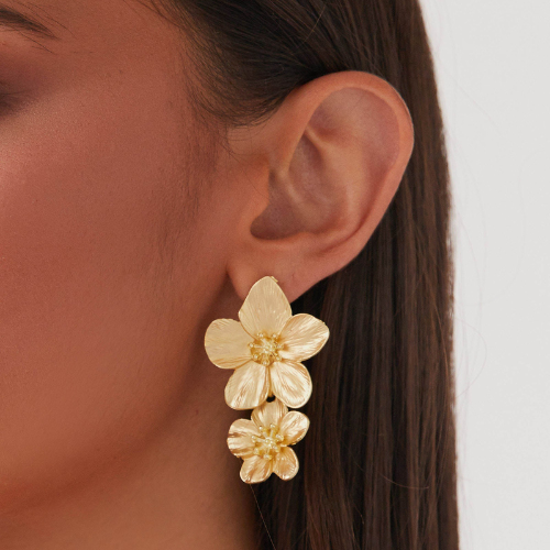 Channel your inner goddess with our stunning double-flower drops. Featuring a high-shine, textured gold finish, these botanical beauties are designed to be the centerpiece of your look.